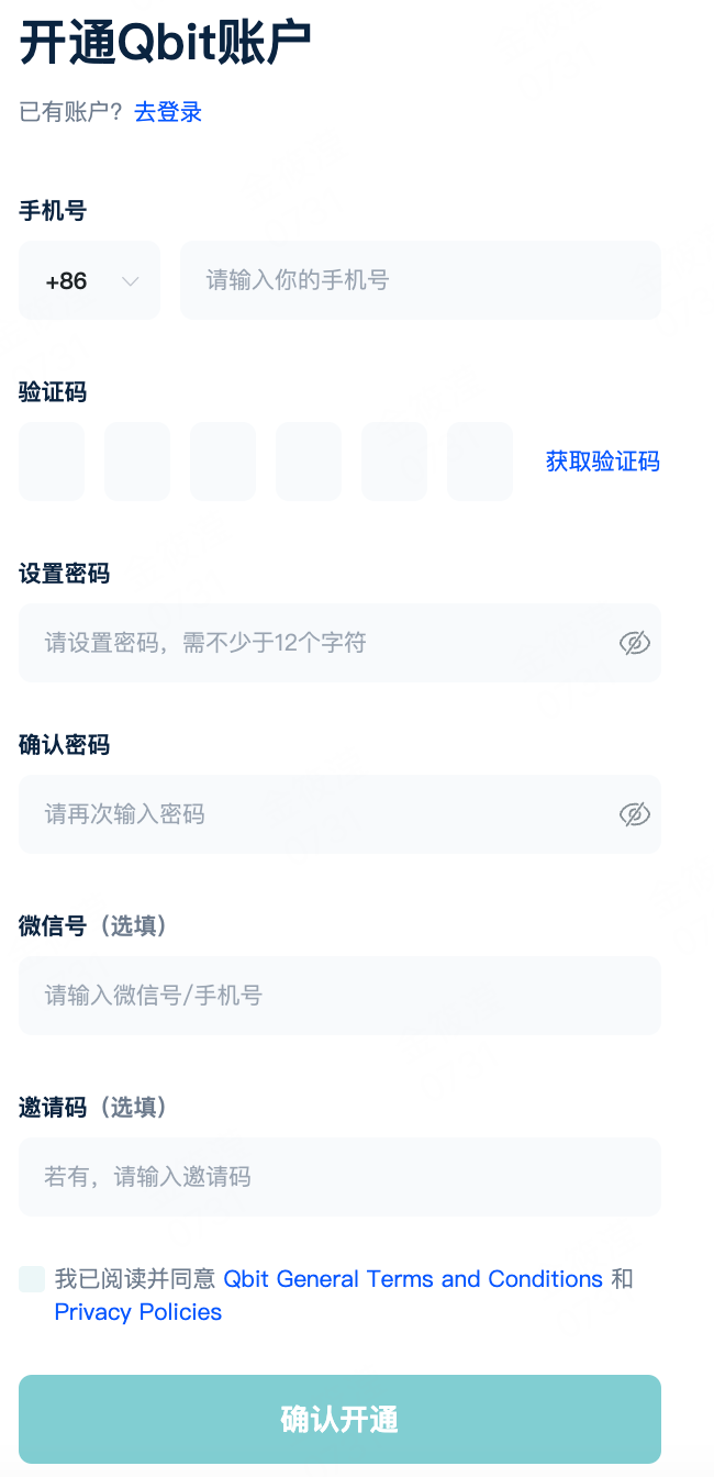 6.勾选【我已阅读并同意Qbit General Terms and Conditions和Privacy Policies】。