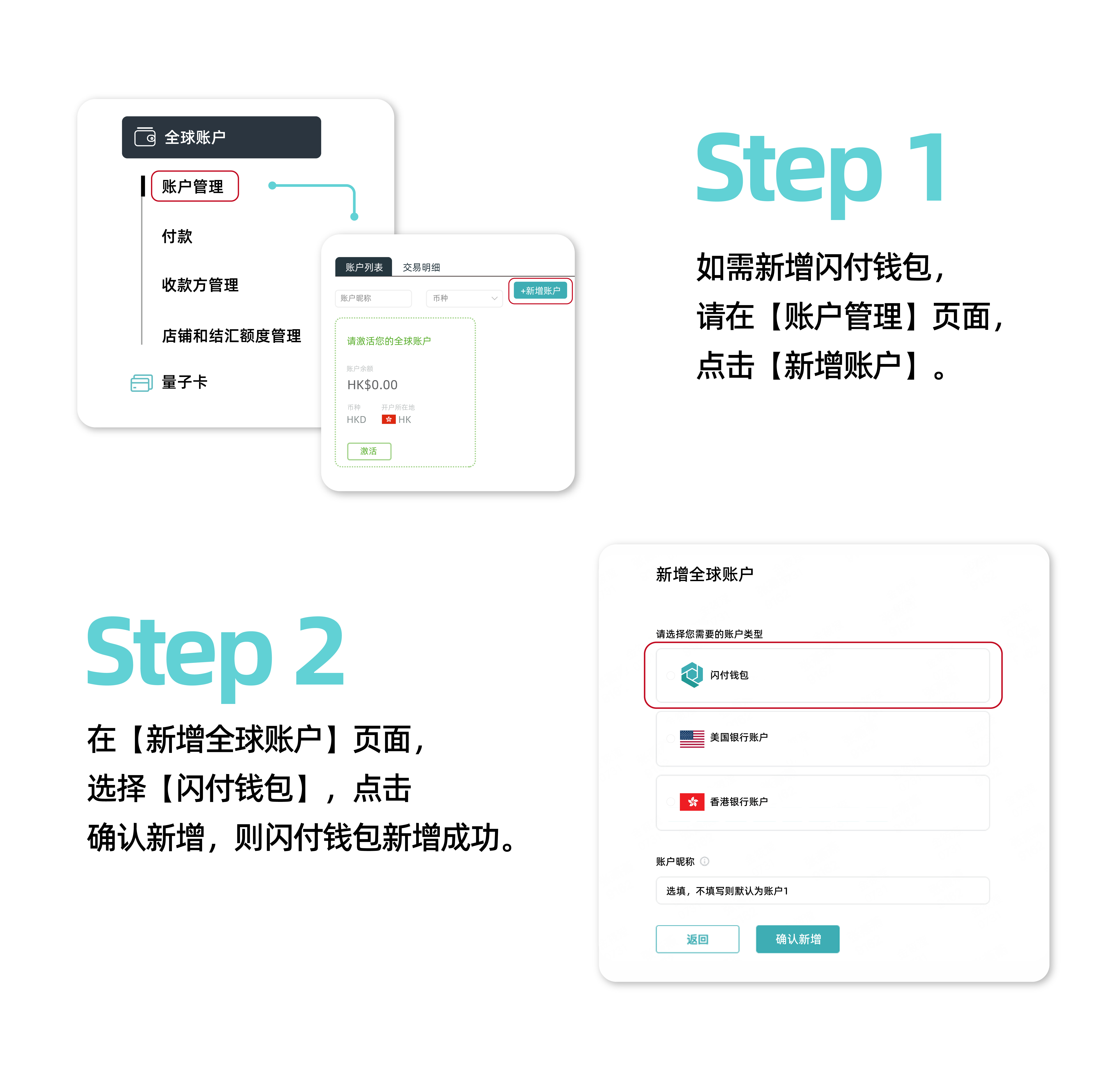 为便于接收其他用户转账,您可以添加「Qbit闪付钱包」。闪付钱包支持充值和付款到外部银行账户,也支持与量子账户之间的资金转入与转出,您可以灵活管理收付款需求。如果您需要添加Qbit闪付钱包,请前往【账户管理】页面,点击【新增账户】,在弹出的【新增全球账户】页面中,选择【闪付钱包】,并点击确认,即可成功添加Qbit闪付钱包。