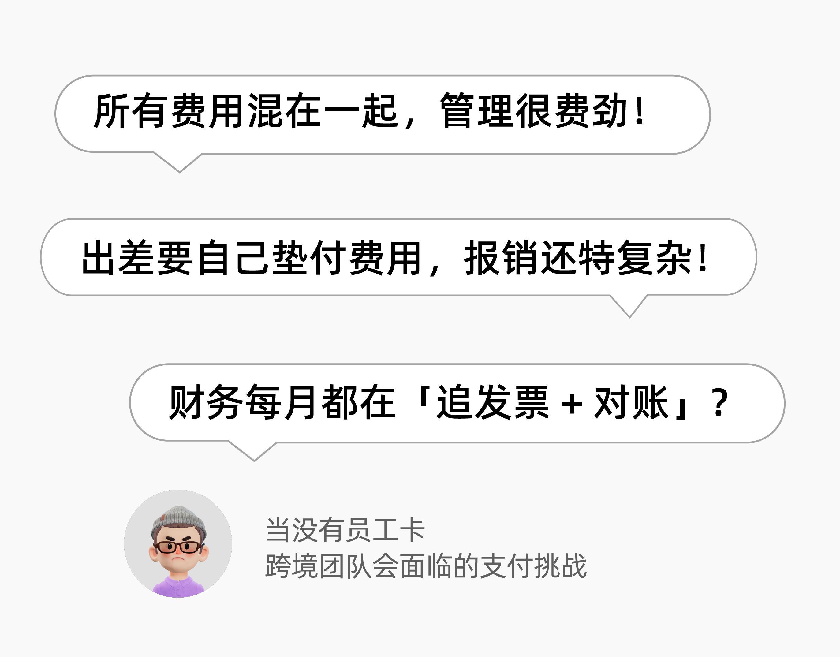 跨境销售与市场团队频繁出差海外参展、拜访客户,以及拓展渠道等,但费用管理仍停留在「个人先垫资、后报销」的模式。例如,跨境销售团队全年在欧美参加展会,每次出差均需自垫费用,在传统报销模式下,员工体验和管理效率问题不断放大。