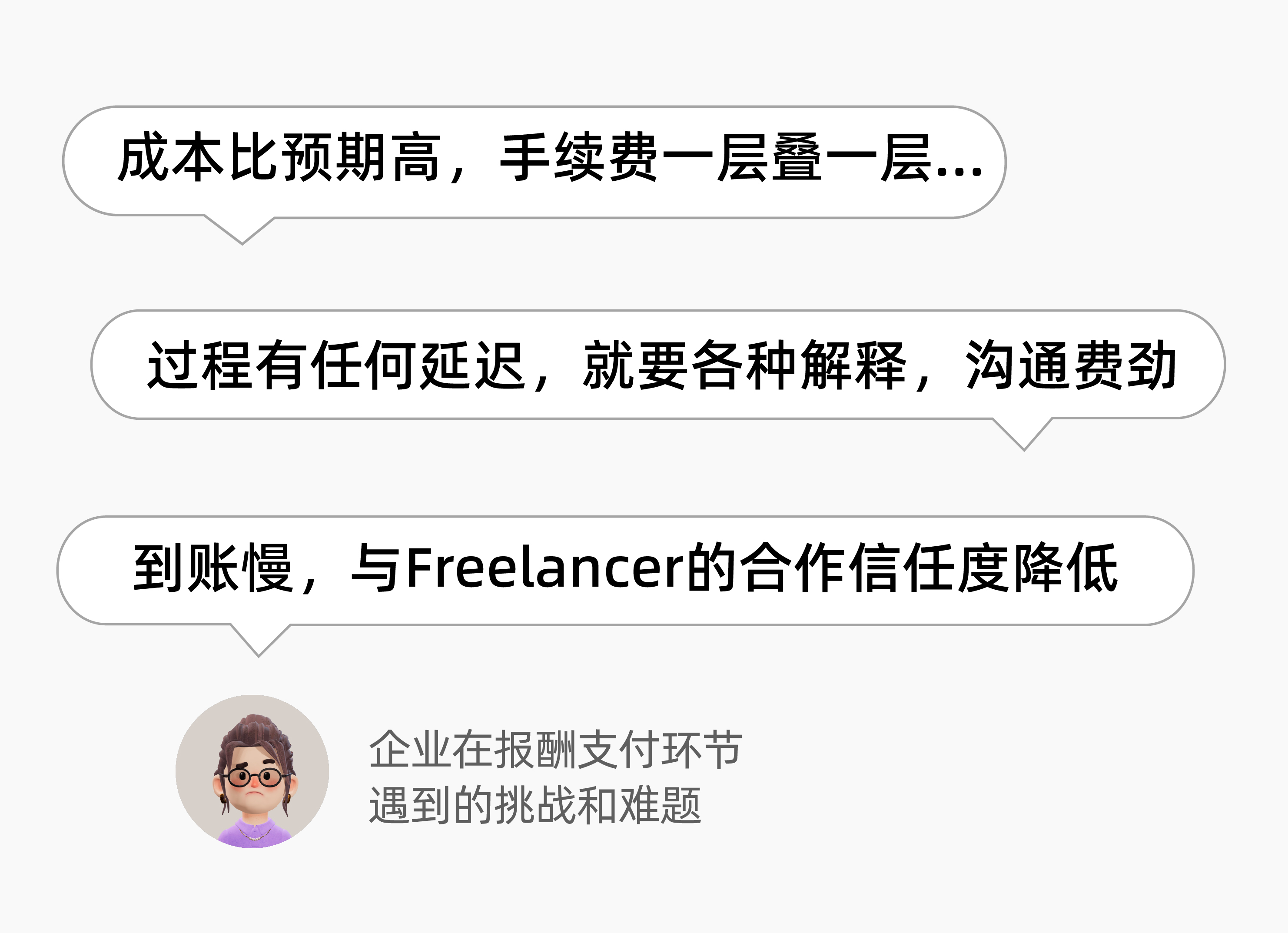 在实际运作中,报酬支付成本高、到账慢、流程复杂、体验不佳等问题频出,并随着业务规模扩大被持续放大,增加财务管理负担,影响远程协作的稳定性和Freelancer合作意愿。