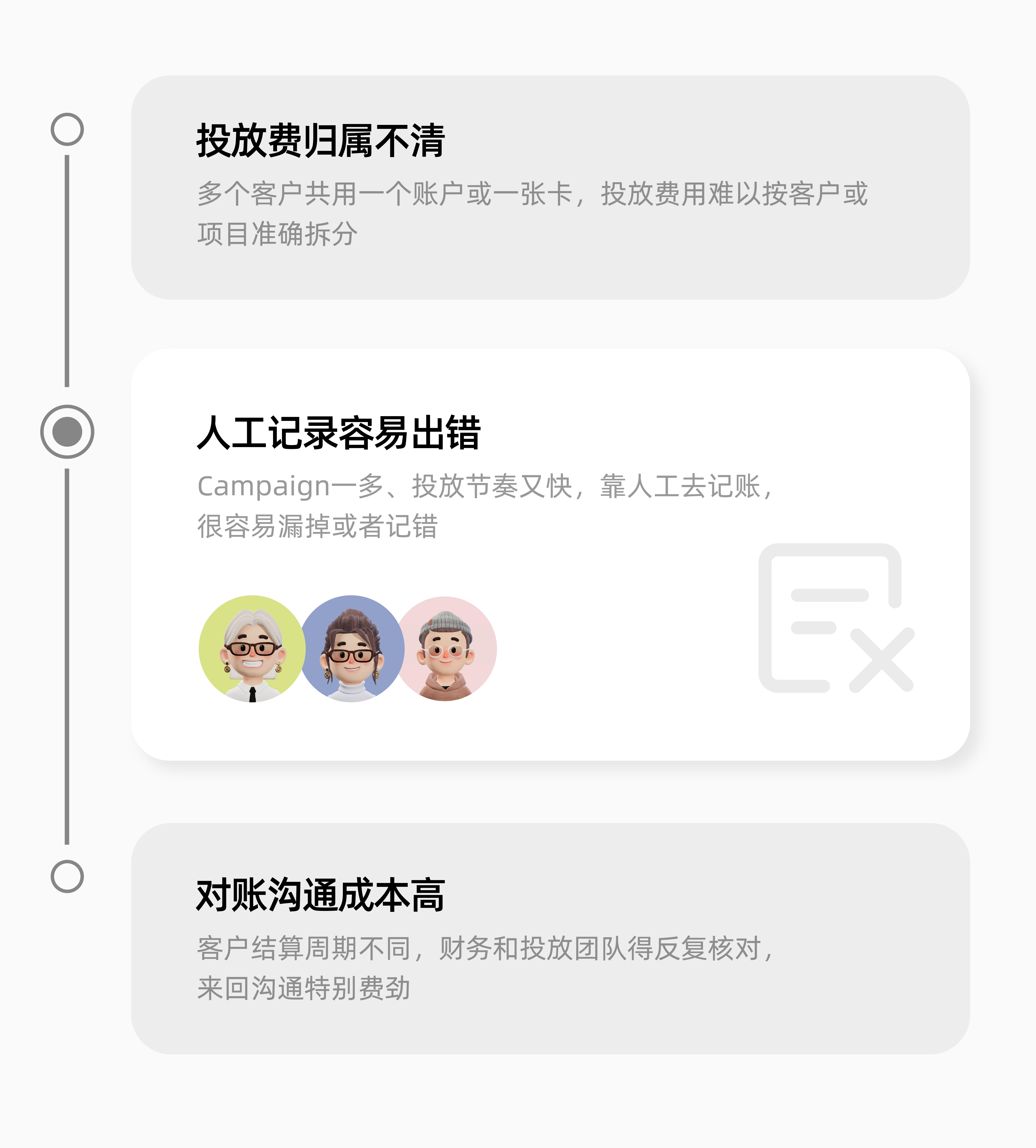 客户一旦追问到具体消耗或某个Campaign成本,在资金如此混乱的情况下就要临时整理一轮数据。在客户少、投放量不大的时候,还能靠人工解决,但后期客户和投放规模上来了,资金透明度、预算可控性、对账效率等就会明显跟不上,然后影响到团队效率和客户信任感。