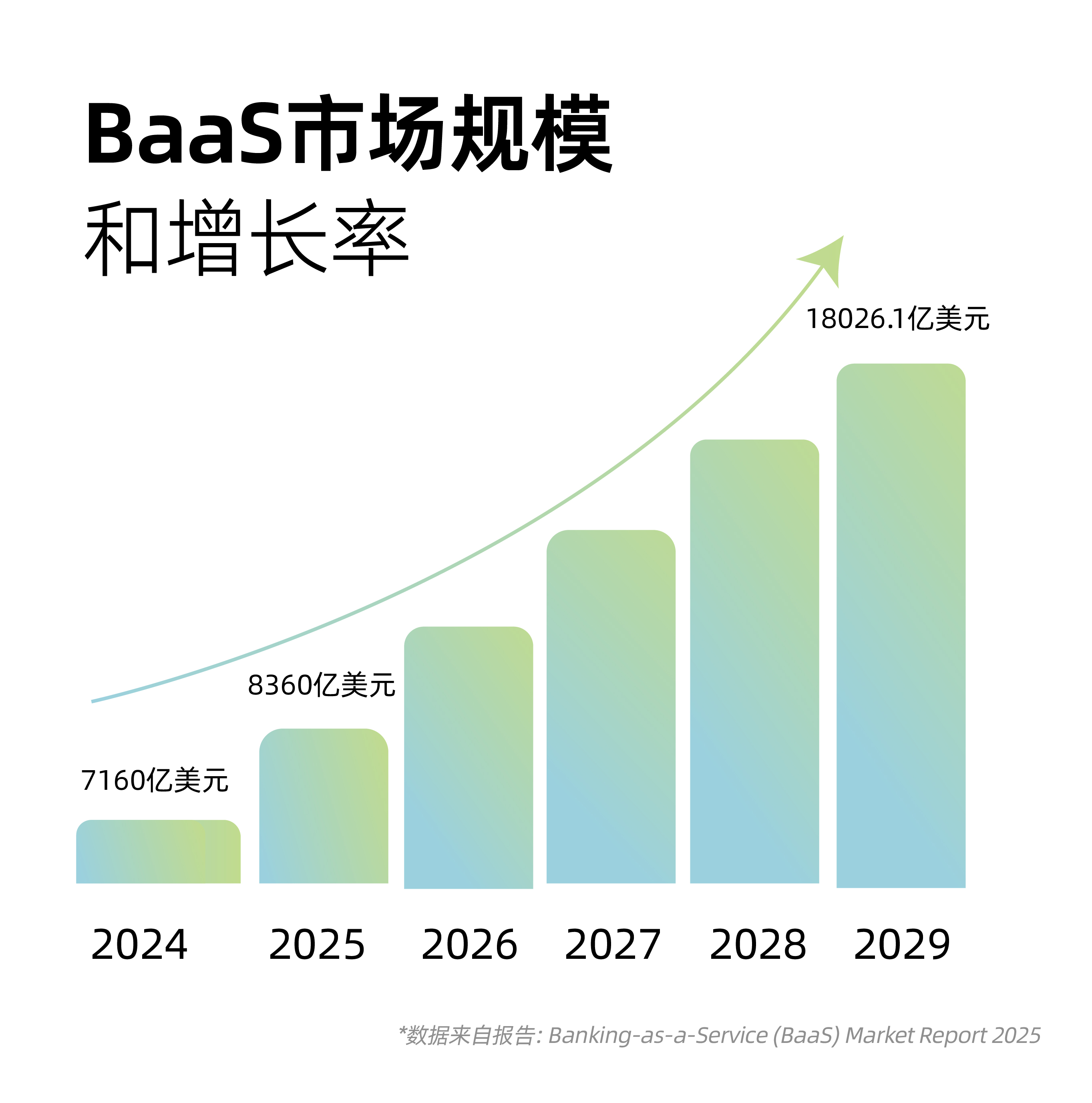 根据Banking-as-a-Service (BaaS) Market Report 2025报告显示,全球BaaS市场规模预计将从2024年的7,160亿美元增长至2025年的8,360亿美元,年复合增长率达16.8%。