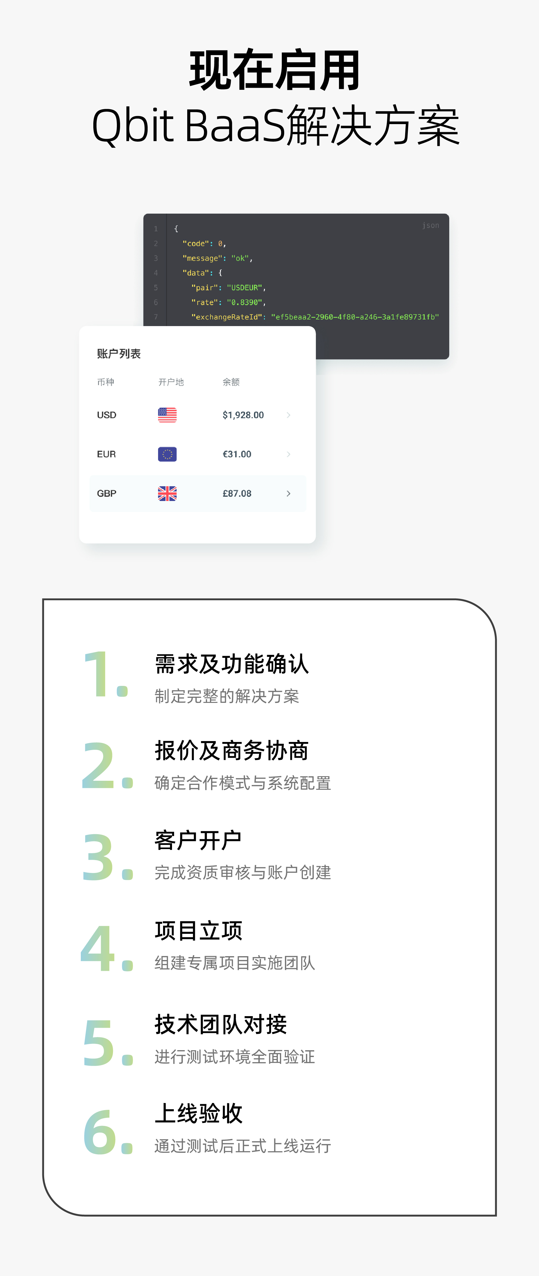 Qbit BaaS通过开放API,使企业和开发者快速接入账户收款与付款功能,实现多账户管理、资金流转和交易处理,一次接入即可覆盖核心金融服务,助力企业高效管理业务并提升客户服务。
