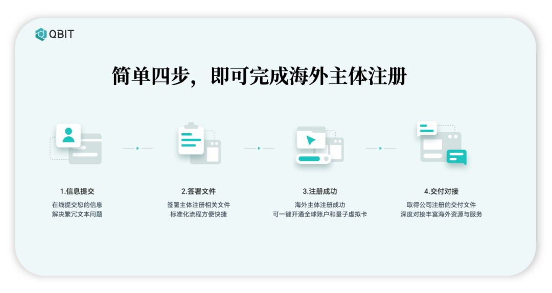 In order to assist enterprises to smoothly conduct business abroad, Qbit provides fast and efficient overseas subject registration services covering the United States, Hong Kong, Cayman Islands, BVI, etc., which can be completed quickly in just four simple steps.