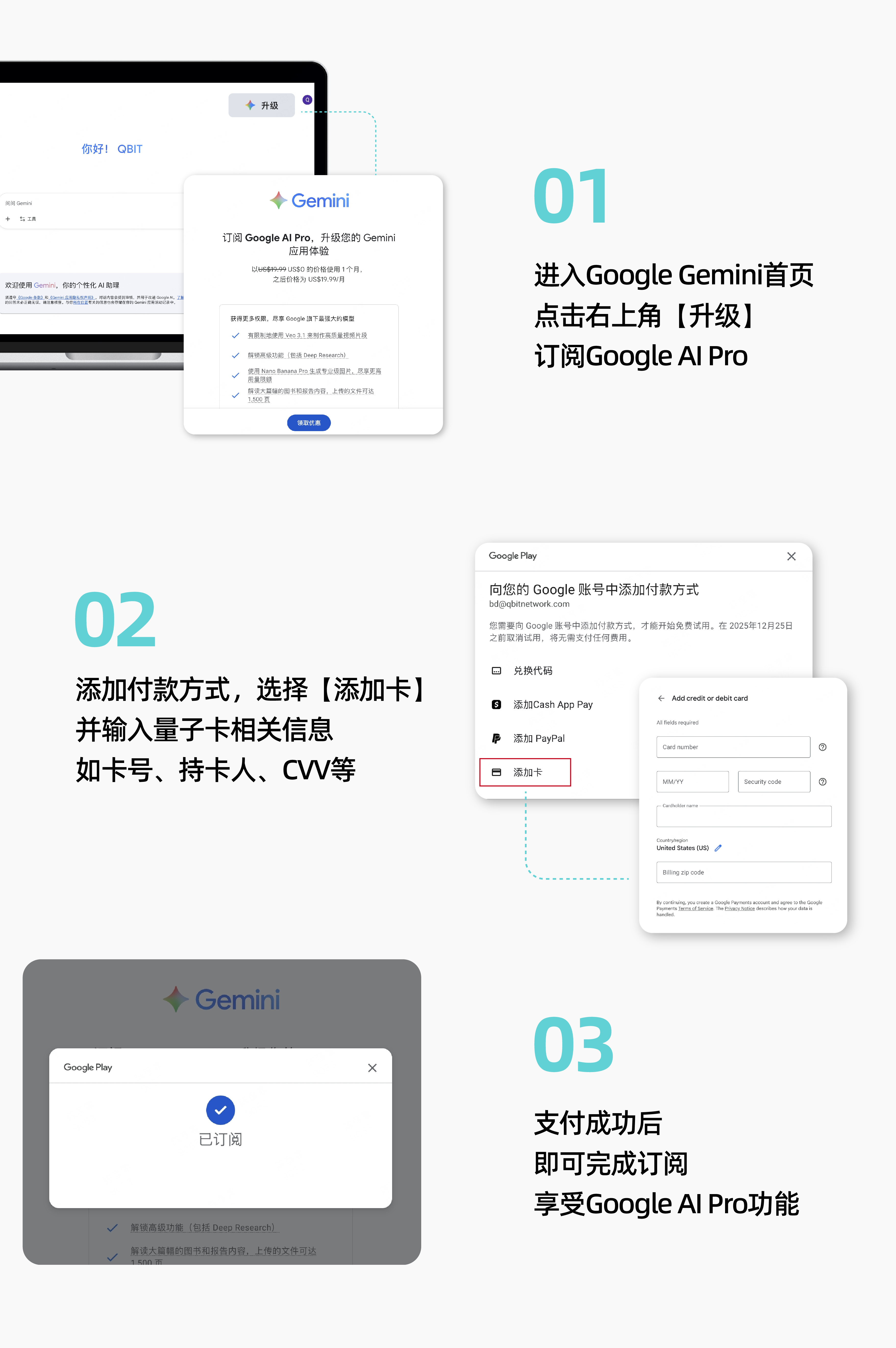 如果团队需要订阅Google Gemini,使用量子卡支付可以享受到更好的支付体验。